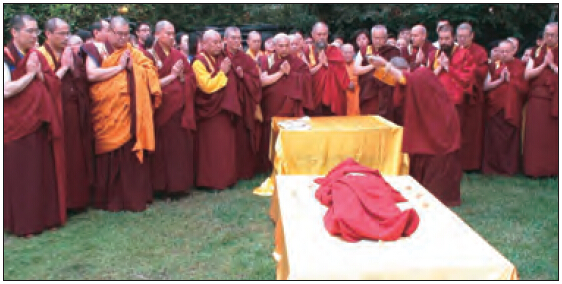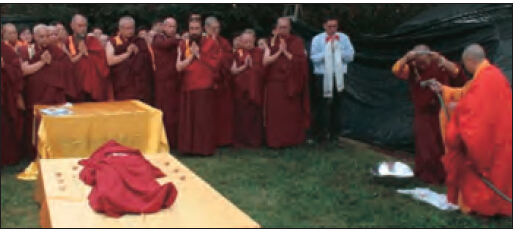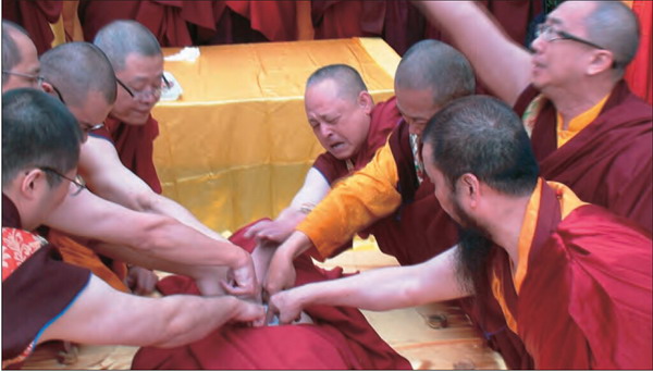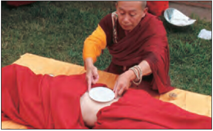 (上圖)炒葯的瓷盤洗凈後放在莫知仁波且腹部,仁波且們結好手印將手指按入磁碟中探溫,不到五分鐘,急速升起的拙火高溫讓他們無法忍耐,紛紛各自放入藥粉撤手,以肚臍拙火為高溫,以瓷盤為鍋鼎,以藥物為配方,開始炒煉。