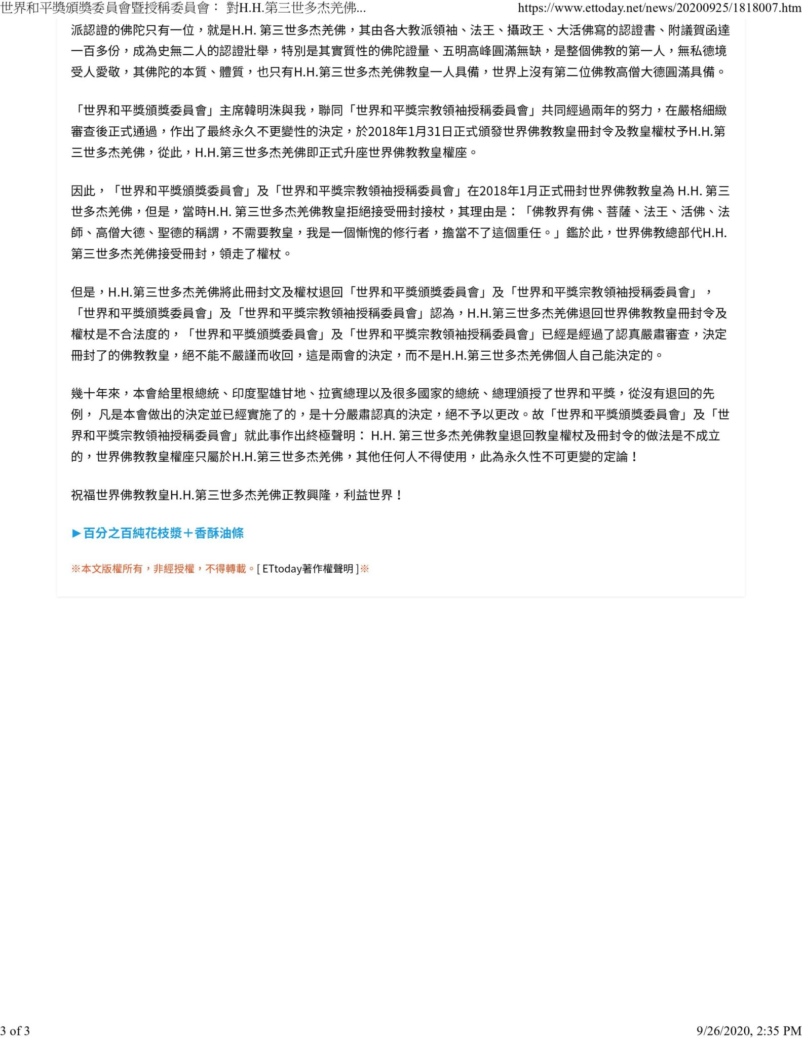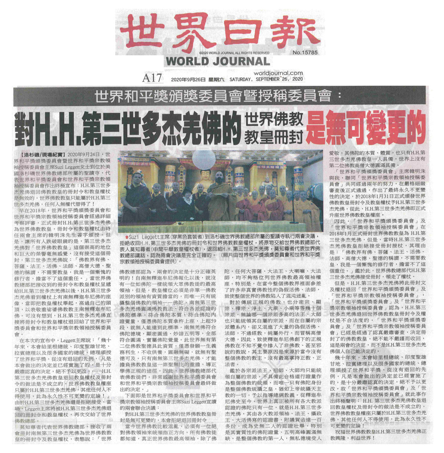 World Journal世界日报——世界和平奖颁奖委员会暨授称委员会——对H.H.第三世多杰羌佛的世界佛教教皇册封是无可变更的_9-26-2020